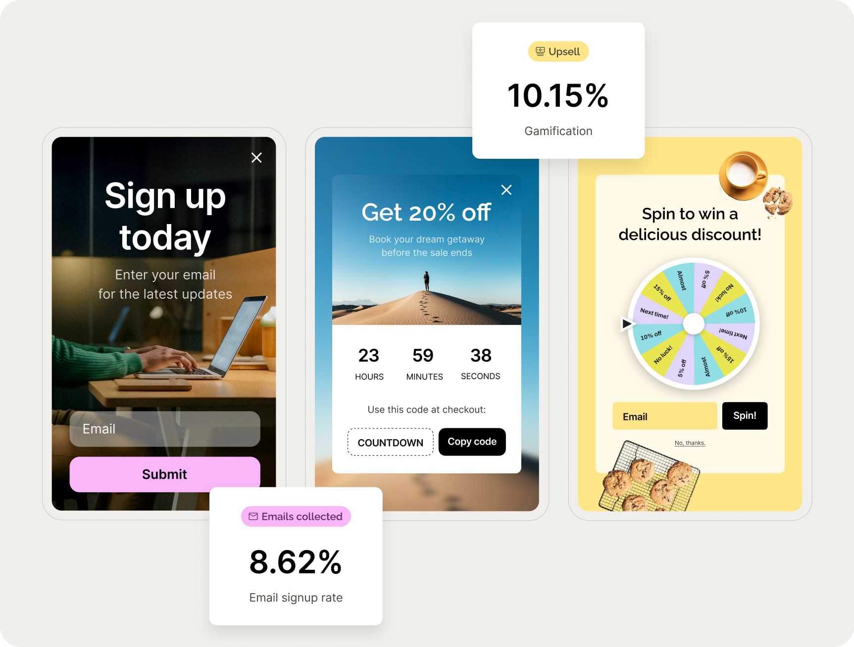 Browse by goal and industry—lead capture, promotions, cart abandonment, announcements, and more. Every template is fully customizable and built to convert.