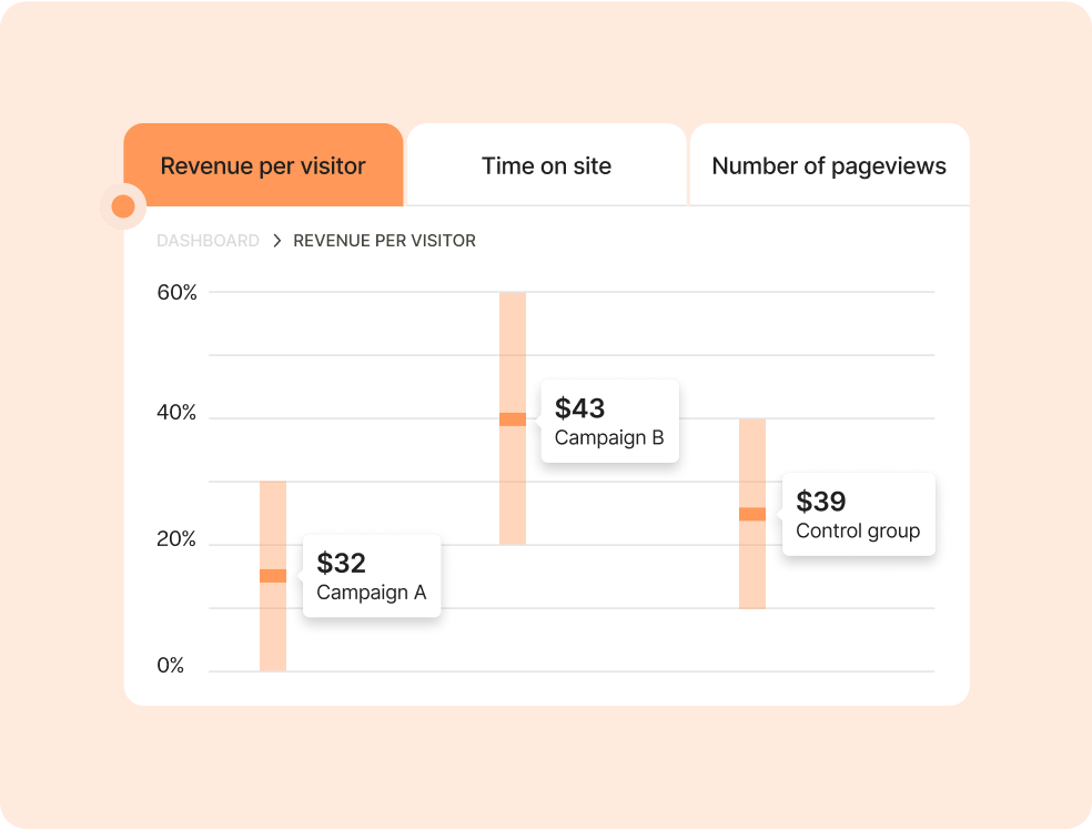 Every campaign comes with revenue-level analytics: revenue per visitor, order rate, and shopper behavior data like session duration, repeat visits, and AOV.